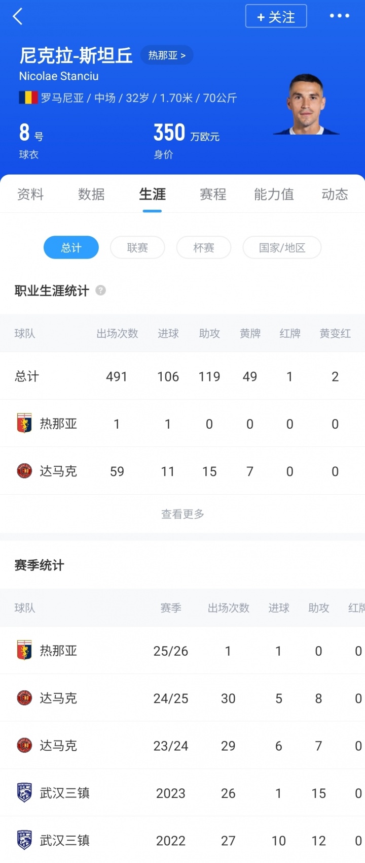 32岁的罗马尼亚中场斯坦丘,曾效力武汉三镇、吉达国民、布拉格斯巴达等多支球队,今夏他以自由身从达马克加盟热那亚,这是他生涯首次效力五大联赛球队。